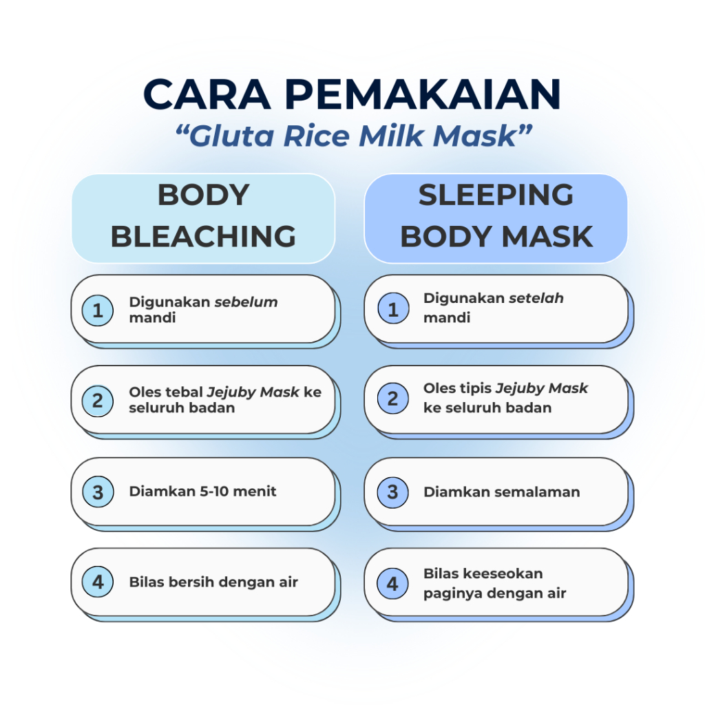 Untuk hasil maksimal pakai saat mandi sore sebagai bleaching dan malam hari sebelum tidur sebagai mask.
