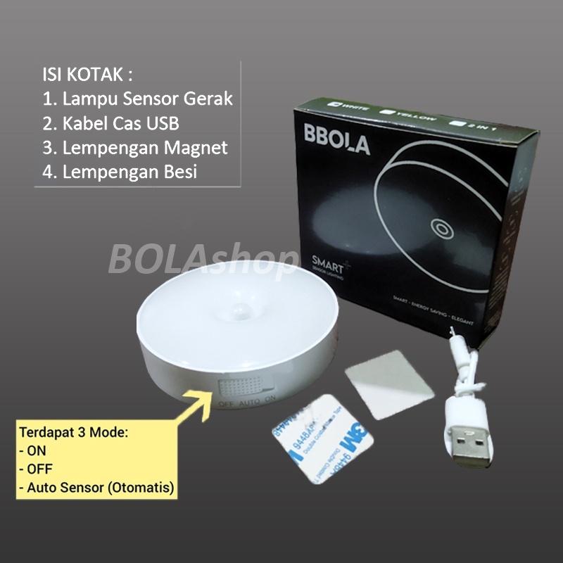Isi paket = kotak, lampu sensor gerak, kabel cas USB