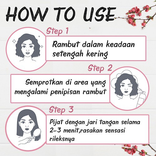 • Dilengkapi dengan aplikator khusus, sehingga kamu lebih mudah menggunakannya. Cara Penggunaan : Cukup semprotkan di kulit kepalamu setelah keramas, kemudian lakukan pemijatan menggunakan ujung jari agar lebih meresap ke kulit kepala. Sekarang, ga perlu lagi takut rontok dan ketombe!