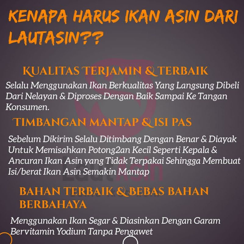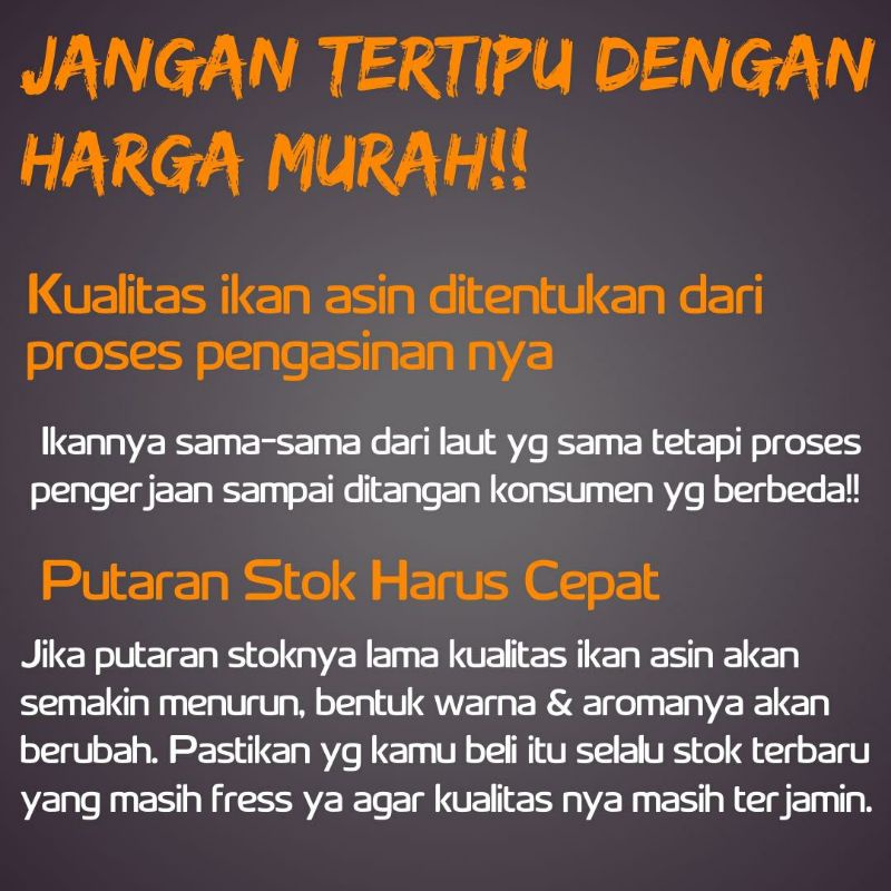 Maaf untuk menjaga kualitas & mutu beberapa ikan asin mengalami kenaikan harga, mengingat cuaca laut yang sedang ombak tinggi. Harga akan normal lagi jika cuaca sudah kembali normal.