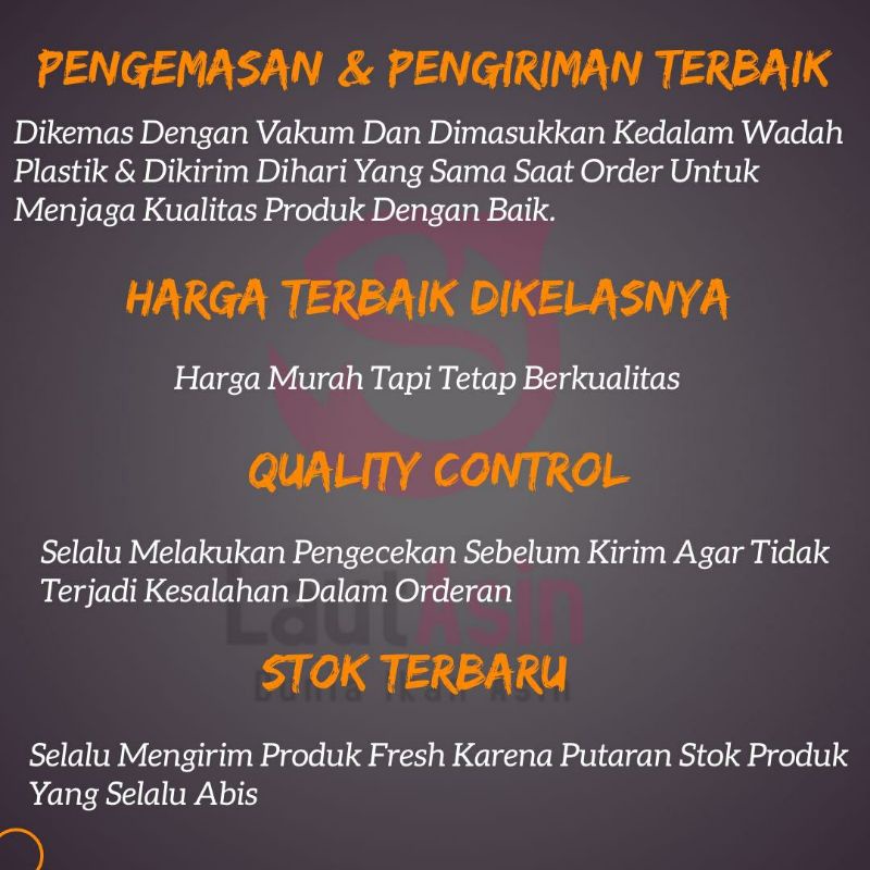 Produk kami dijamin fresh dan berkwalitas, karna 100% produk langsung dari para nelayan dikerjakaan pengasin ikan profesional.