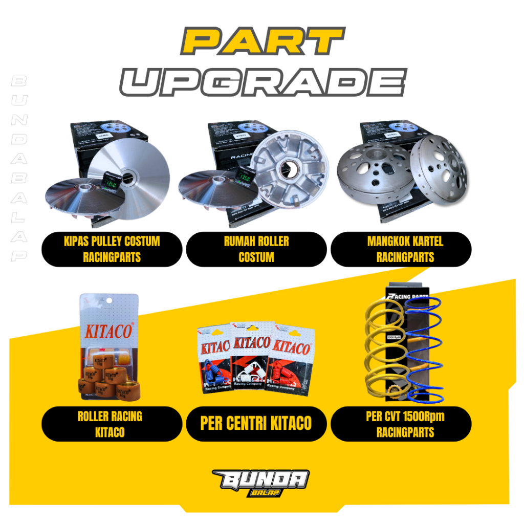 Tingkatkan performa motor Anda dengan paket up kirian yang dirancang khusus untuk motor Vario, Beat, PCX, NMAX, dan Aerox! Kami menawarkan paket up kirian yang lengkap dan berkualitas untuk meningkatkan tenaga, kecepatan, dan responsifitas motor Anda.