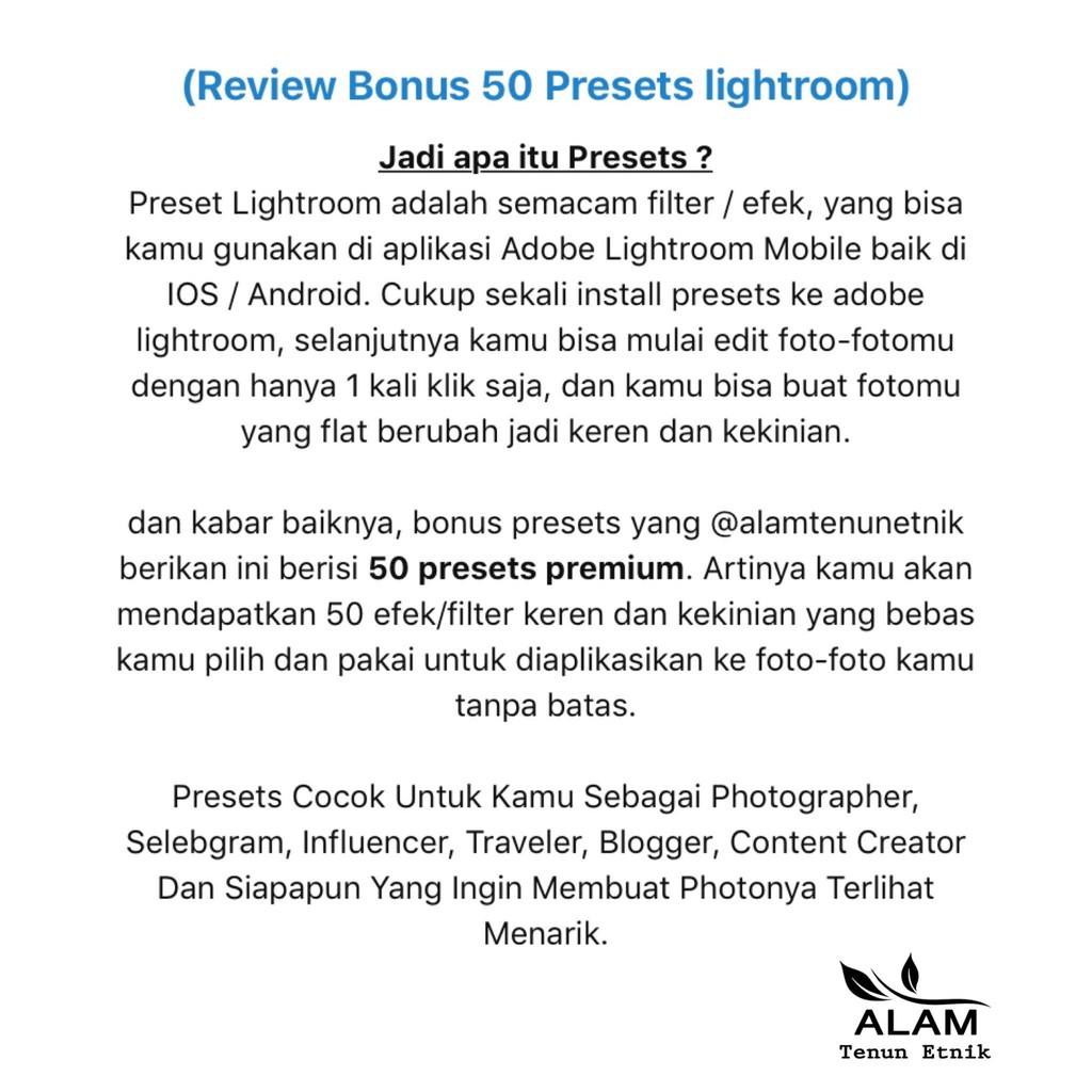 * Untuk Bonus 50 preset lightroom akan dikirim via email.