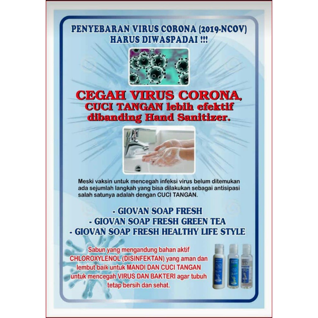 Penyebaran Virus Corona Harus diwaspadai meski vaksin untuk mencegah infeksi virus belum ditemukan ada sejumlah langkah yang bisa dilakukan sebagai antisipasi salah satunya adalah dengan RAJIN MENCUCI TANGAN!! (Cuci tangan lebih efektif dibandingkan Hand Sanitizer.GIOVAN sabun yang mengandung Bahan aktif CHLOROXYLENOL(Disinfektan) yang aman dan lembut baik untuk MANDI dam CUCI TANGAN untuk mencegah VIRUS dan BAKTERI agar tubuh tetap bersih dan sehat.