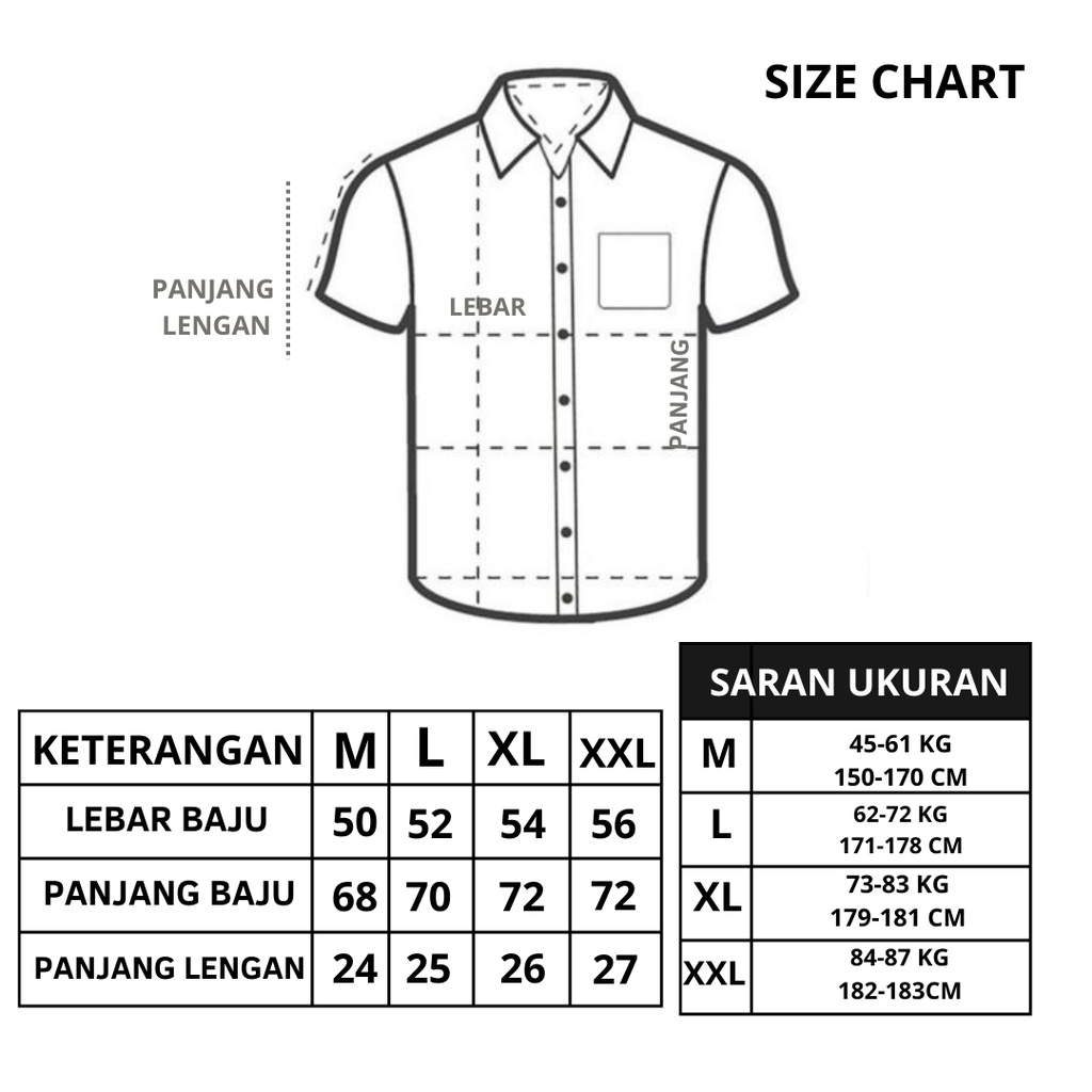 "HARAP DI PERHATIKAN SIZE DETAIL KEMEJA AGAR TIDAK TERJADI KESALAHAN SIZE (TOLERANSI SIZE +- 1 SAMPAI 2 CM)"