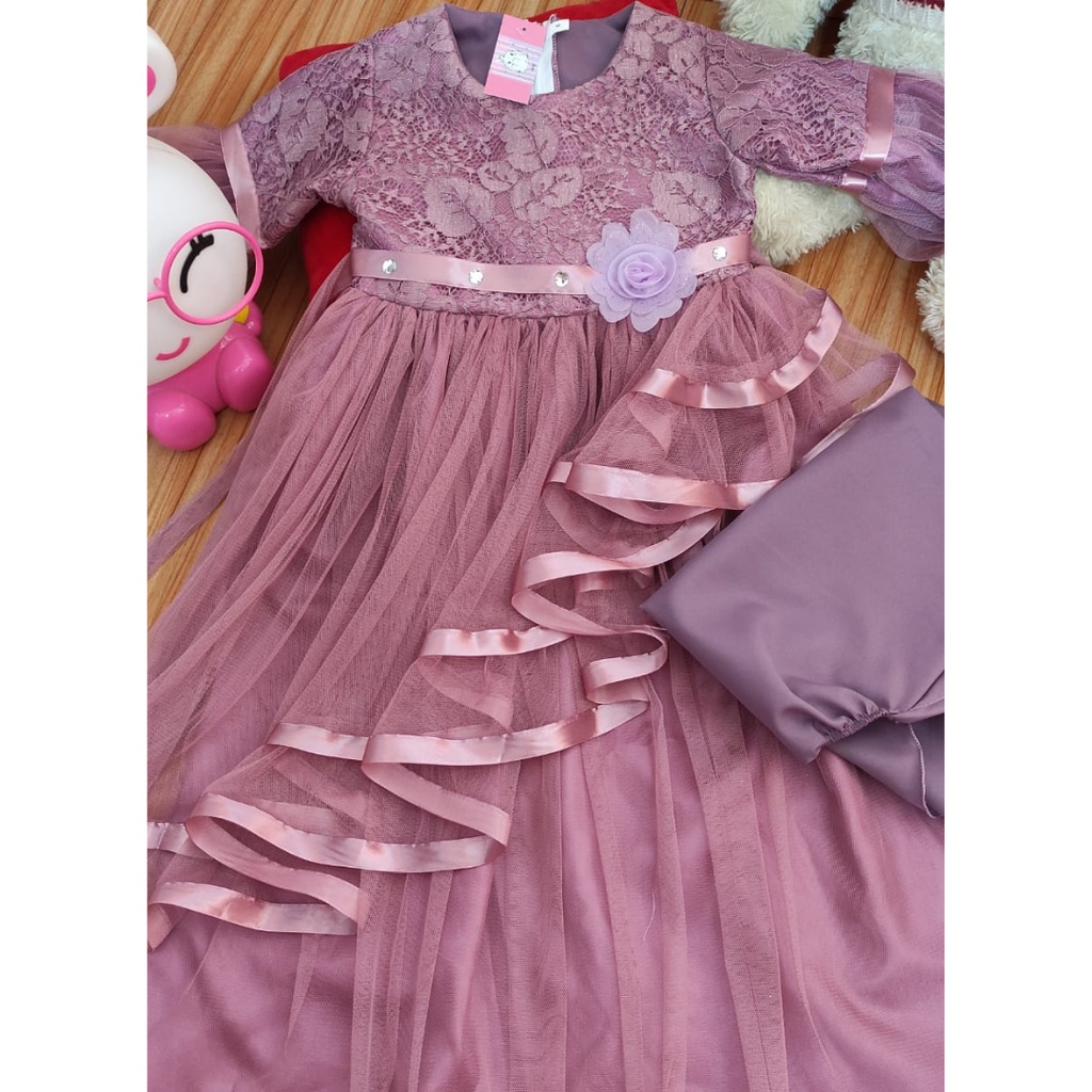 Baju anak muslim perempuan dengan bahan brukat kombinasi tile, dilapisi puring dibagian dalamnya.