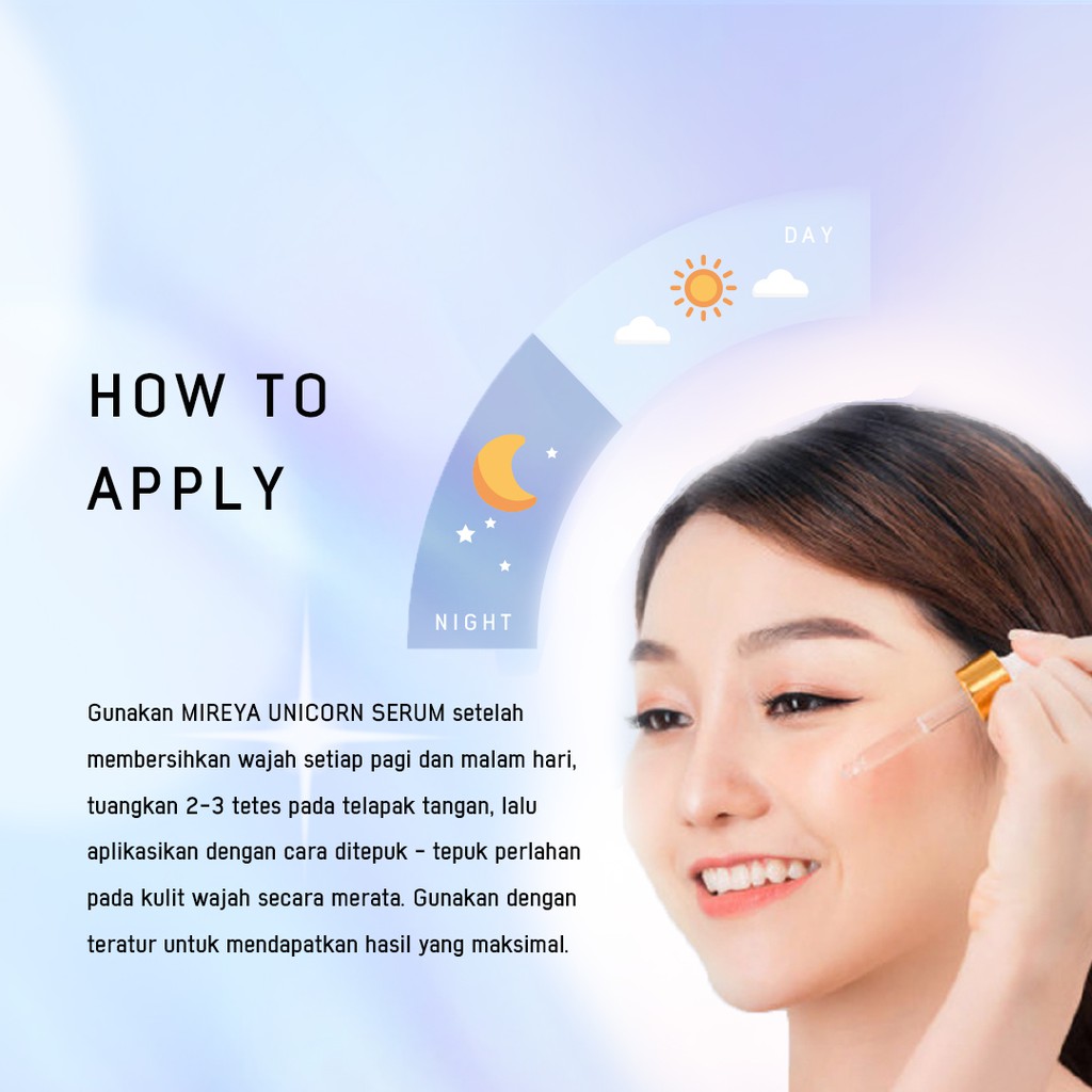 Bersihkan wajah terlebih dahulu, kemudian teteskan 2-3 tetes Unicorn Serum Brightening & Moisturizing pada tangan atau langsung ke wajah, kemudian usapkan pada kulit wajah yang sudah dibersihkan hingga batas leher secara merata. Gunakan serum ini sebelum menggunakan krim malam/krim pagisecara teratur setiap hari.