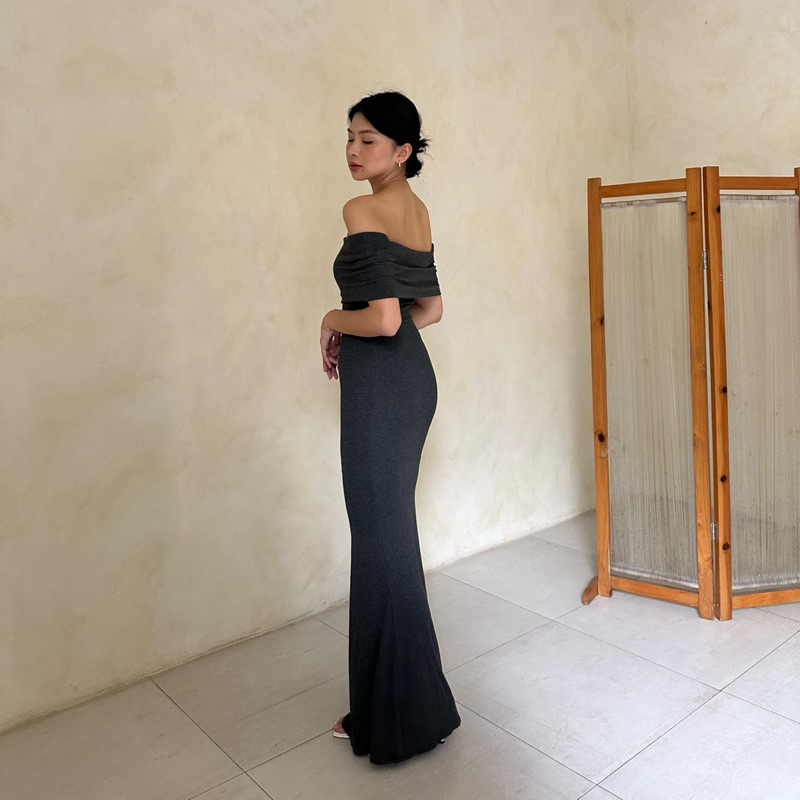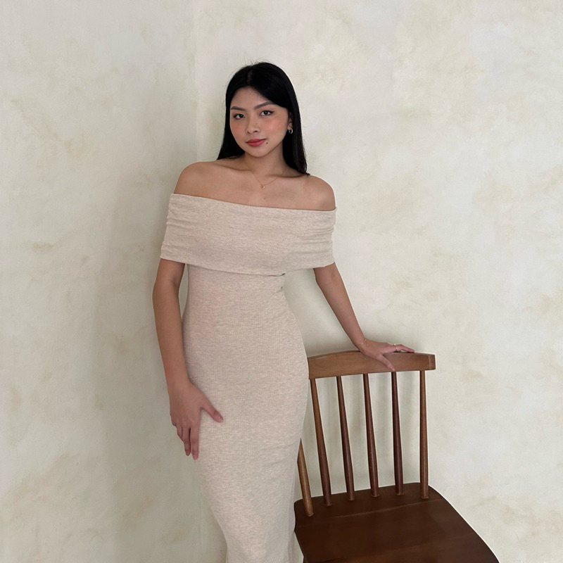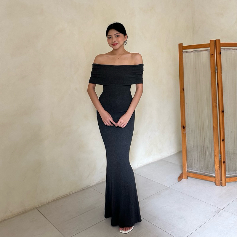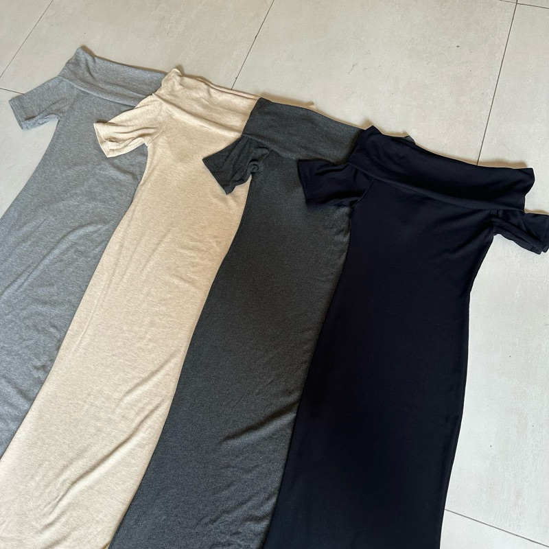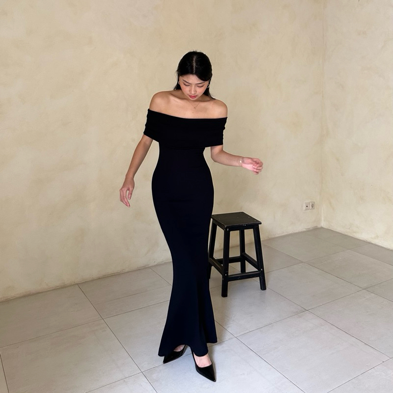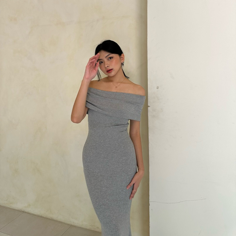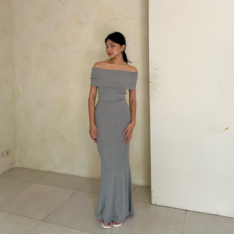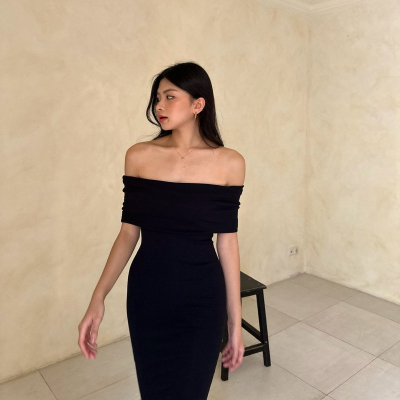 DIANE DRESS | ROOHA | Dress Panjang Wanita Off Shoulder Ribbed Knit Terusan Maxi Sabrina Dress Korean Long Dress