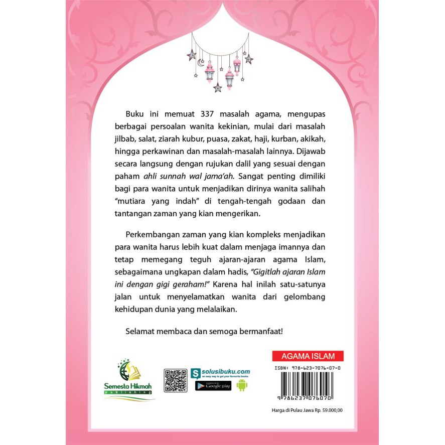 Buku ini memuat 337 masalah agama, mengupas berbagai persoalan wanita kekinian, mulai dari masalah jilbab, salat, ziarah kubur, puasa, zakat, haji, kurban, akikah, hingga perkawinan dan masalah-masalah lainnya. Dijawab secara langsung dengan rujukan dalil yang sesuai dengan paham ahli sunnah wal jama’ah. Sangat penting dimiliki bagi para wanita untuk menjadikan dirinya wanita salihah “mutiara yang indah” di tengah-tengah godaan dan tantangan zaman yang kian mengerikan.