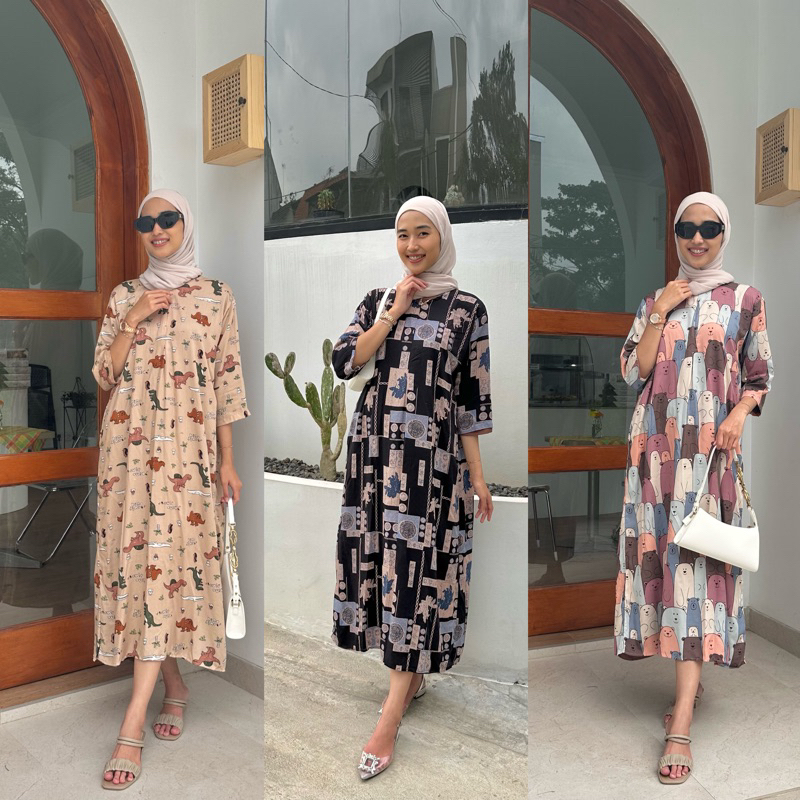 Daster Gamis Viral Rayon Motif Kekinian Lengan 3/4 Dress Panjang Wanita Muslim