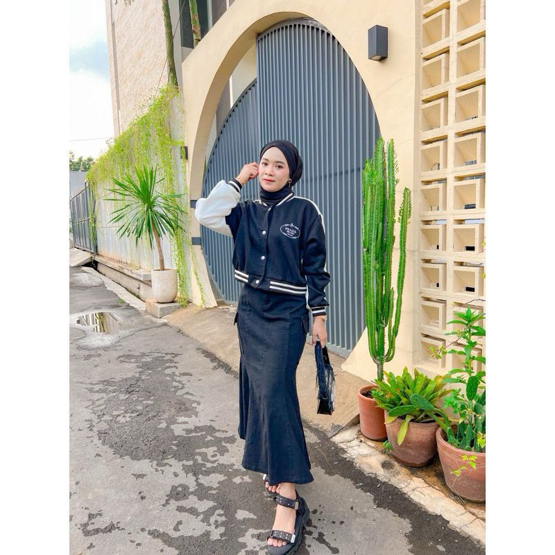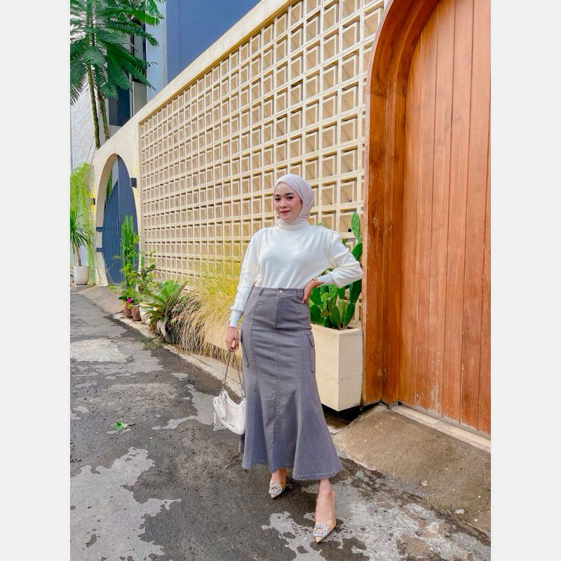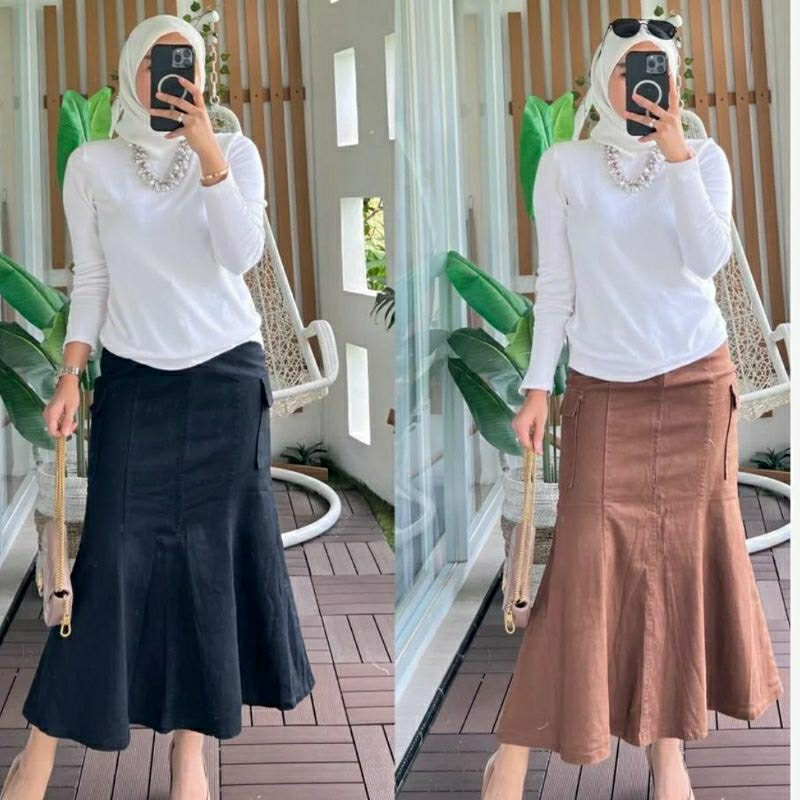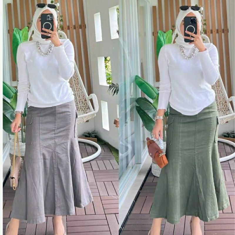 MODEL ROK DUYUNG PINGGANG BAGIAN BELAKANG KARET, 2 SAKU CARGO, KANCING DEPAN DAN RESLETING, TIDAK ADA BELAHAN