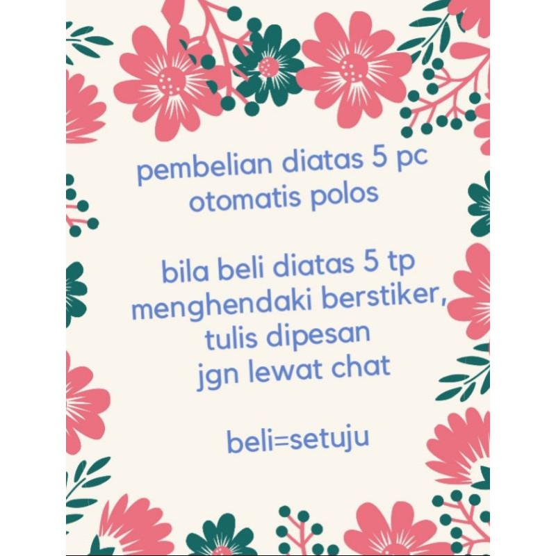 Ukuran ini beli diatas 5 pc, OTOMATIS TANPA STIKER, krn byk yg menghendaki tanpa stiker.